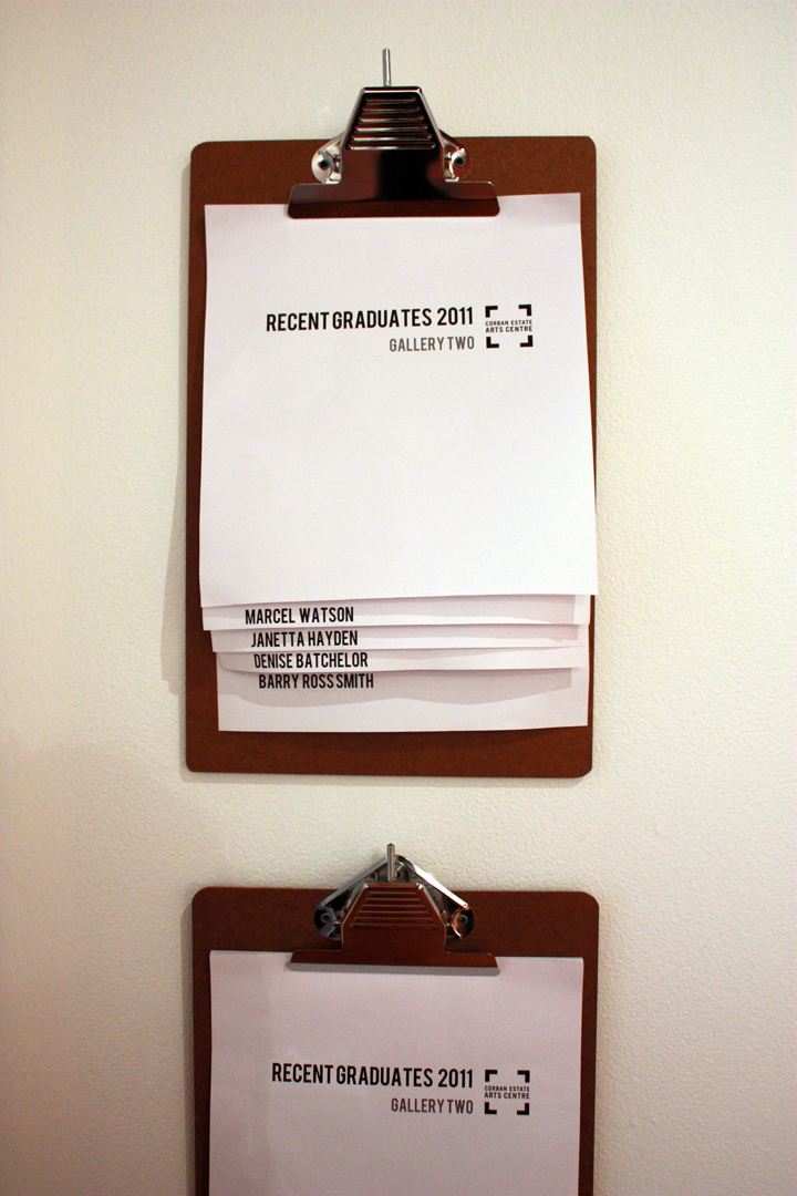 ‘The Recent Graduates 2011 Exhibition’ (December 2011/January 2012): Corban Estate Arts Centre's annual showcase of newly-graduated students from tertiary institutions around Auckland. Marcel Watson, Janetta Hayden, Denise Batchelor, Barry Ross Smith, Natalie Guy, Vanessa Gleye, Cheng-Yi Fey and Margaret Estall.