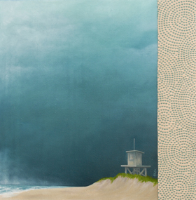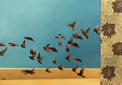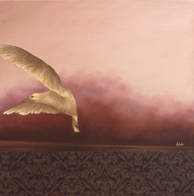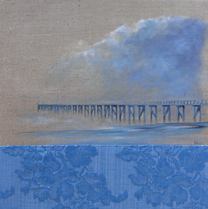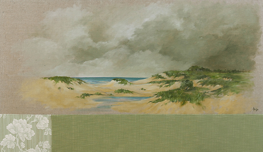 'Remnants' - 2006 at Spectrum Gallery . Wellington. Oil on canvas and pattern fabric "With her work "Remnants", Anne-Sophie opens "Grandma's attic, unfolds memories as precious forgotten letters and old family photos and brings to the landscape an old fashion look. The raw canvas and fabrics give a sense of tradition and old fashion which supports the image of a memory and set the time.The decorative aspect is intentional, allowing the 'memory painting' to fit into an interior as a family photo or a family history icon would become part of a homely decor."